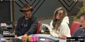 随后双方亮牌。Guilbert拿着A♣ 10♥,而Aubakirov的底牌是A♠ K♣。Guilbert以一对10领先。