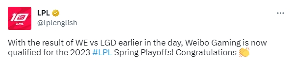 直播吧3月16日讯 今日LPL官方在推特上宣布,因为WE对阵LGD的结果,WBG现在获得了2023年LPL春季赛季后赛的资格。