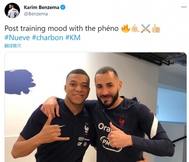 法国队正在进行欧洲杯的备战工作,重返国家队的本泽马晒出与姆巴佩的合影,两人在照片中笑得很开心,本泽马写道:“和现象级球员训练的心情。”