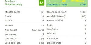 直播吧11月11日讯 北京时间11月11日19:00,世预赛亚洲区12强赛A组第5轮韩国主场迎战阿联酋的比赛。上半场曹圭成、孙兴慜远射中柱,黄喜灿点射破门。下半场孙兴慜头球中楣,此后双方均无建树,最终,韩国1-0阿联酋。