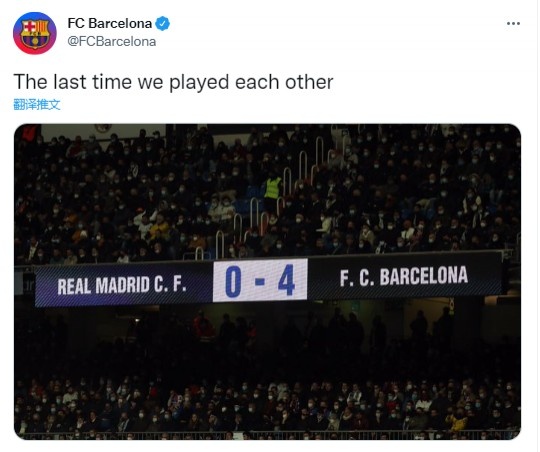 直播吧7月23日讯 巴萨官推晒出上次国家德比的比分图,当时巴萨是在客场4-0大胜了皇马。