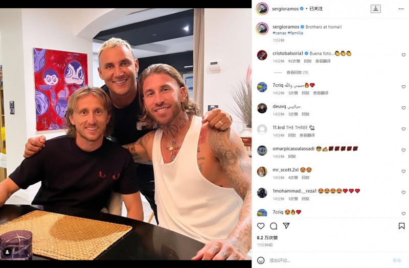 直播吧8月23日讯 比赛日结束之后,巴黎球星拉莫斯今天在社媒晒出了自己在家里与朋友聚会的合照。在他身旁的是昔日的皇马队友莫德里奇和皇马巴黎两个时期的队友纳瓦斯。拉莫斯配文:好兄弟一家人。