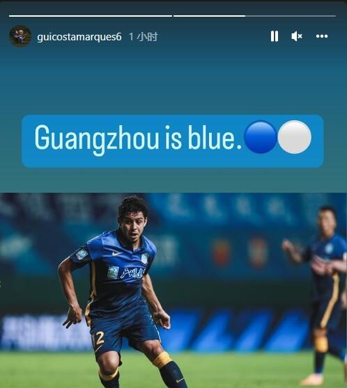 中超第18轮广州德比,广州城凭借李永佳的世界波破门1-0击败广州队,广州城外援吉列尔梅赛后晒出比赛图庆祝胜利,他同时写道:“广州是蓝色的。”