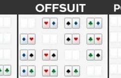 上图中,手牌组合占所有牌的3.02%,另一个可能范围B如下:01线性范围定义:线性范围是由牌力最好的开始,直到我们希望继续游戏的最差的牌构成,牌力最高的牌大家应该都能明白是AA, 牌力第二的牌是KK,至于牌力最低的牌,由整个线性范围的宽度决定,可能是JTs, 也可能是54s。整个范围在翻牌前表格上是一个连通的块,没有间隔。例如上述A就是一个线性范围,而B则不是。