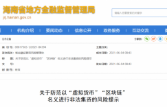 6月4日,海南省地方金融监管局、人行海口中心支行、海南银保监局、海南省委网信办、海南省公安厅、海南省市场监管局等六部门联合发布风险提示,提醒广大金融消费者和投资者防范以“虚拟货币”“区块链”名义进行非法集资。