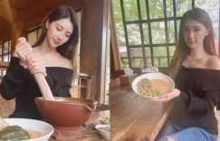 「氣質正妹」客家擂茶體驗,一字領秀「白嫩香肩」,衣領下暗藏兩球雪白麻糬!