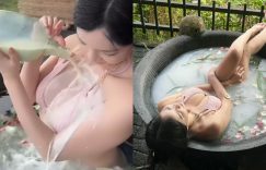 夏天清涼玩水,秋冬泡湯舒壓,四季都少不了比基尼的養眼畫面,不過要真正性感的美體就不多了,尤其是這位不容錯過的「羅莉Rolly」,戶外的圓形大鐵鍋造型,剛好塞下她一人的身軀,水面上浮著香氛的花瓣,穿著粉紅比基尼的她享受在其中,還拿起一壺牛奶,淋在豐滿的美乳上。 (圖片來源: ▶ ▶ ▶